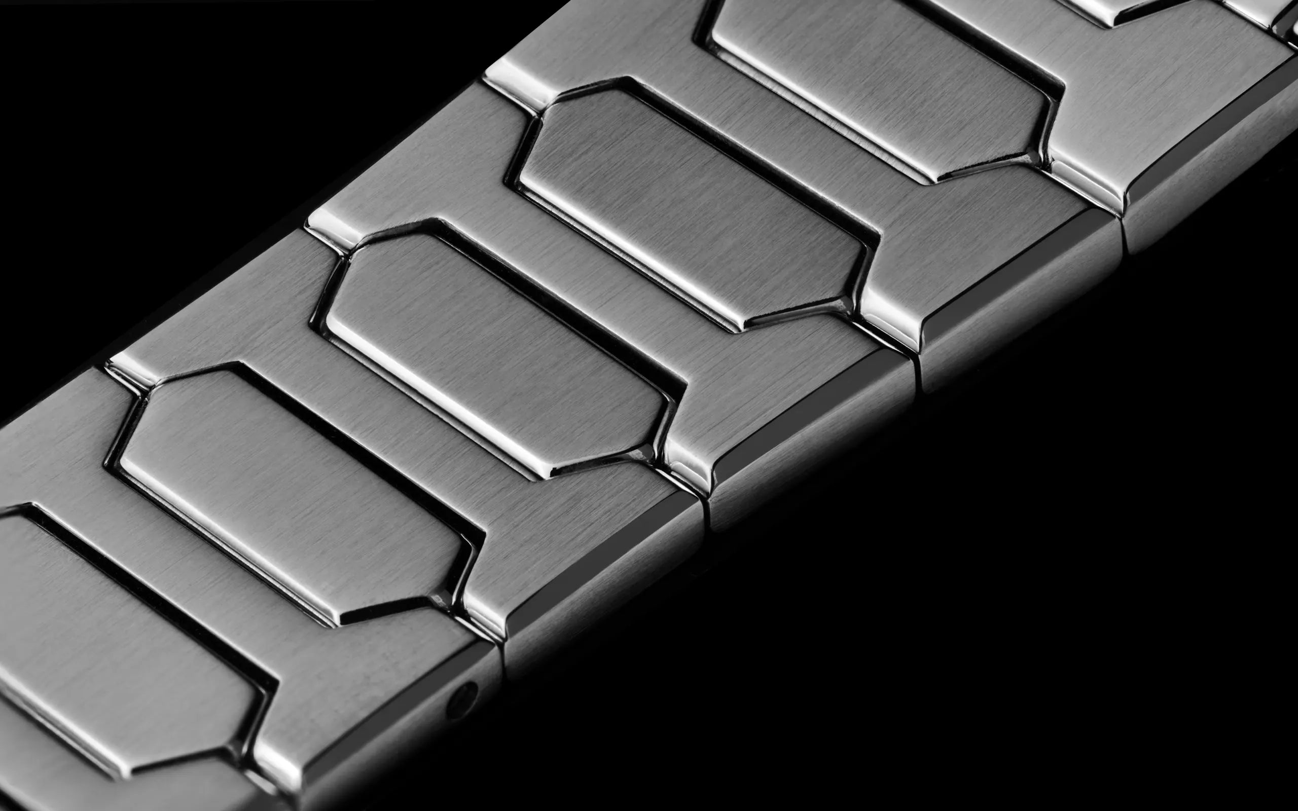 As with the case, the same spectacular attention to finish has been paid here, with strong, even vertical brushing throughout that drops off into sharp, mirror-like chamfers along the outer edges of each link. These exterior edges are complemented by similarly gleaming reliefs on the internal boundaries — each of which has been finished extensively by hand to offer up a distinct visual contrast to the finely brushed flat expanses. On the wrist, this path breaks up into its individual tiles; each link reflecting light differently in a dazzling spectacle.