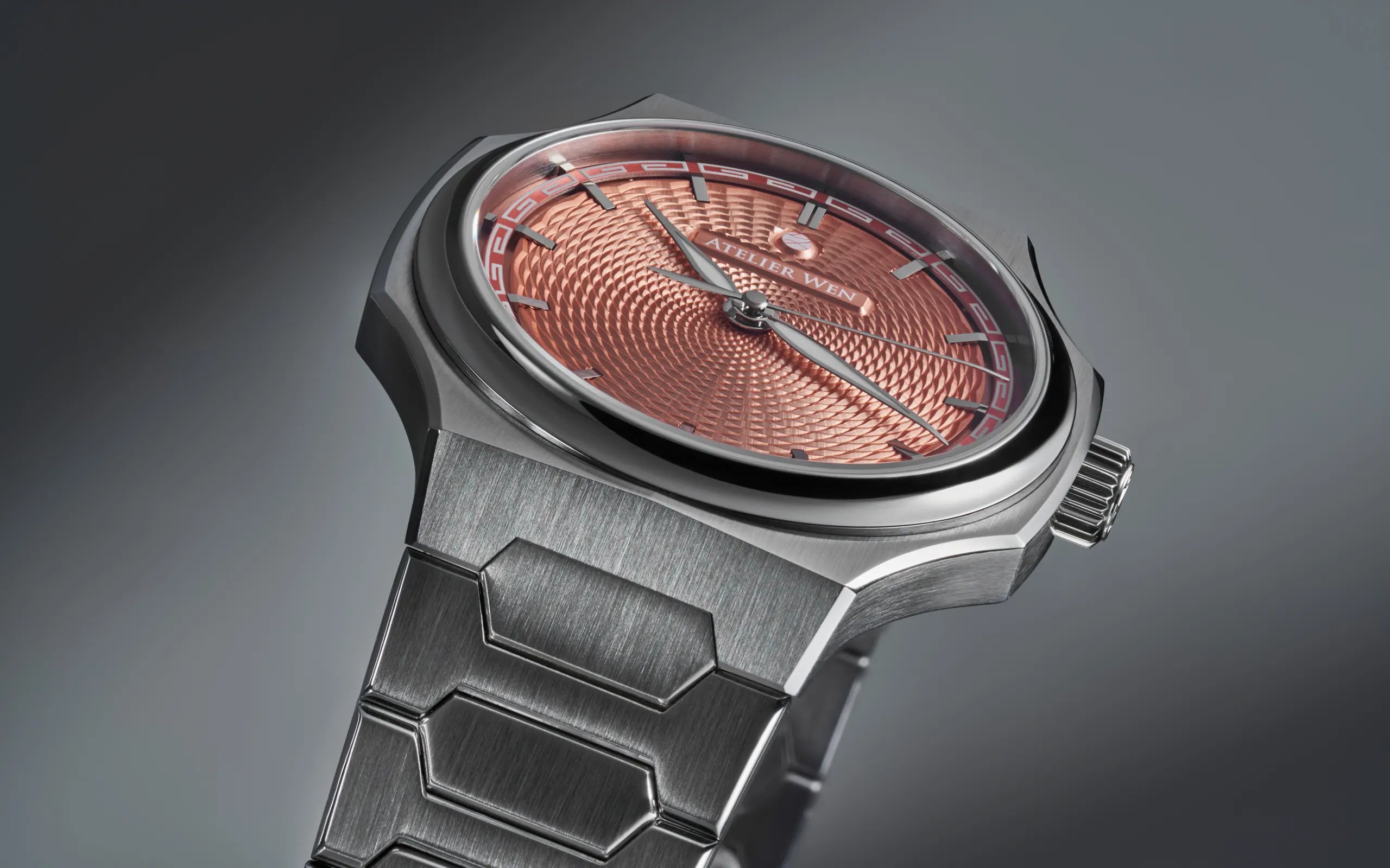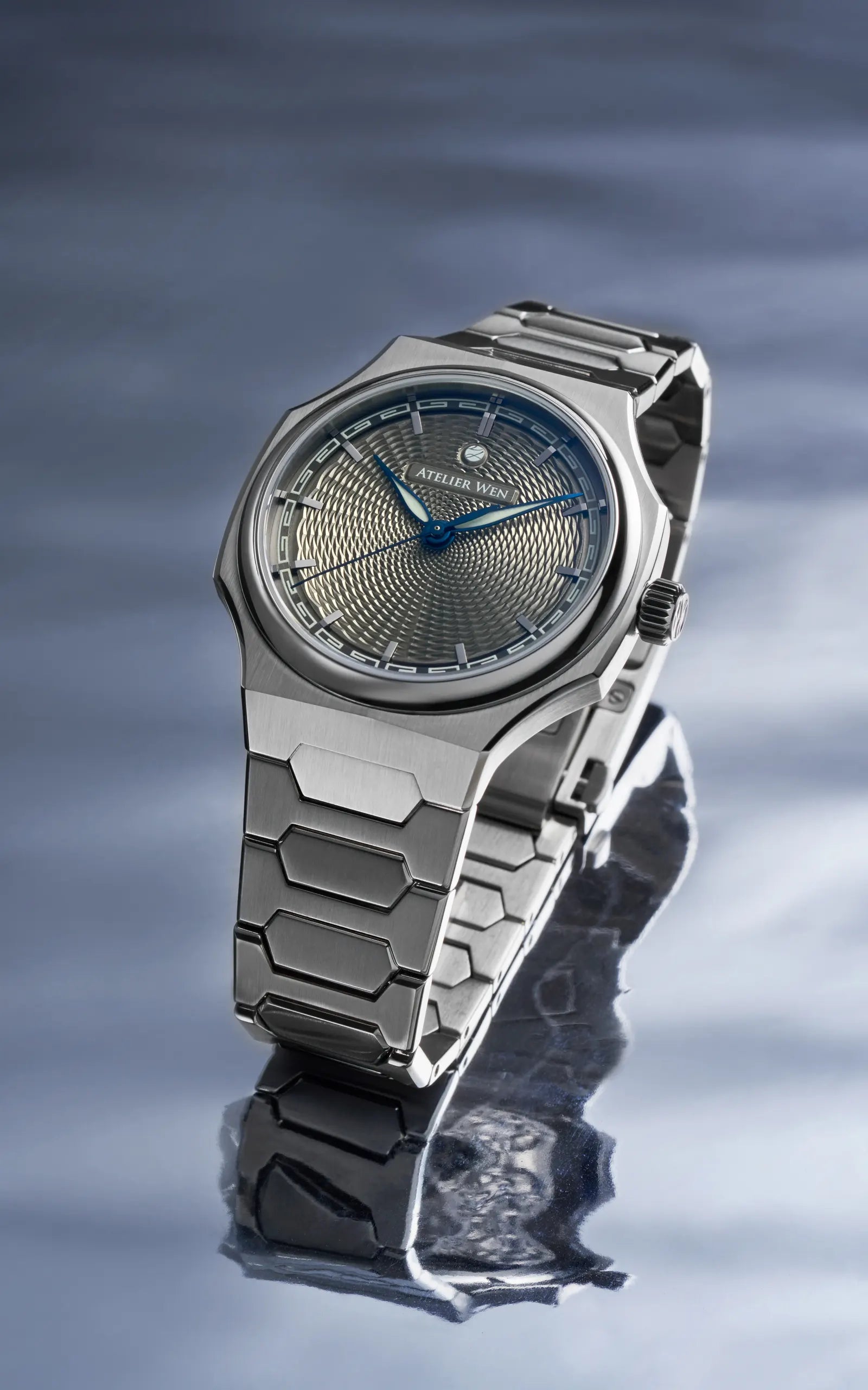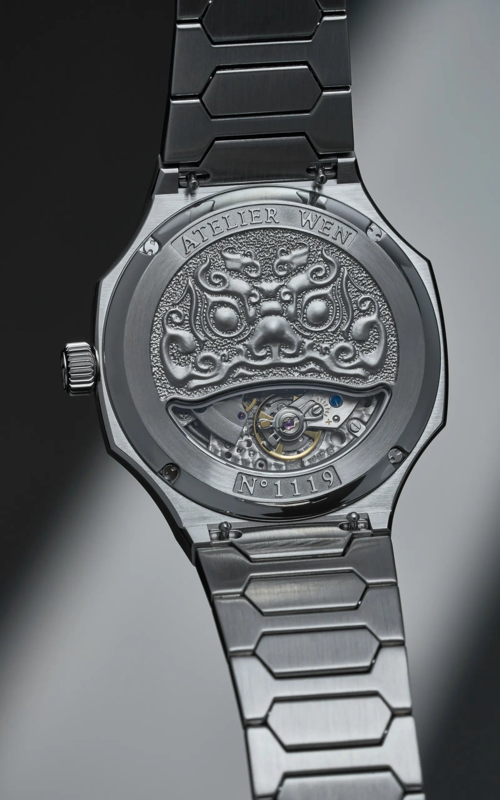 Perception's quick-release bracelet forms a gleaming path that leads up to its case. The bracelet's central links feature an uncanny asymmetry in their hexagonal shapes, and once more hark towards elements like rooftops and windows found in traditional Chinese architecture.