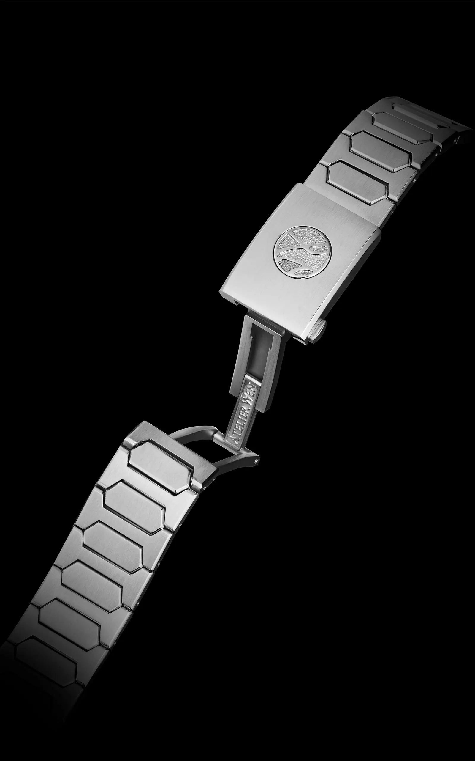 The bracelet is complemented by a fully customised, patent-pending clasp with an on-the-fly micro-adjustment mechanism that has been developed in-house. Made of no less than 32 parts, it is operated through a large, central pusher that is concealed behind our logo that adorns the middle of the clasp.